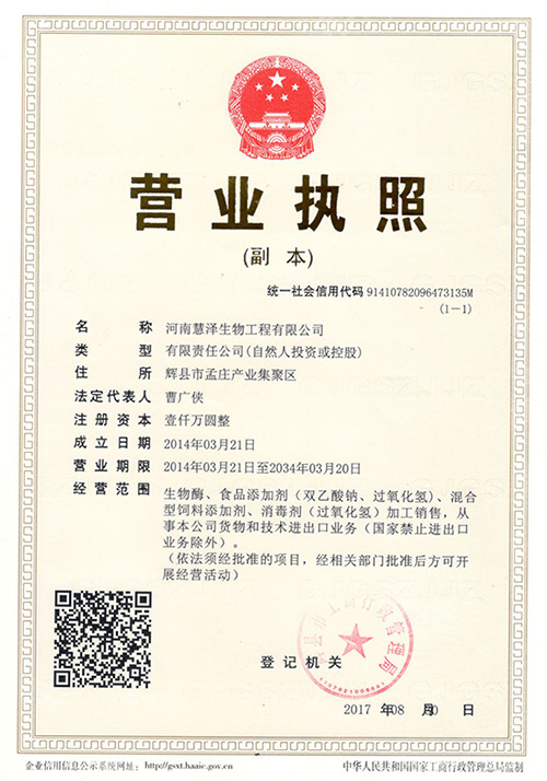 鄭州慧澤生化科技有限公司是一家充滿朝氣的科研生產型高技術企業。目前公司業務主要集中在精細化工、食品化工和微生物制劑行業。公司現已建成鄭州、焦作、新鄉三個生產基地,其中河南新鄉輝縣孟莊生產基地占地70畝,總投資達1.2億。現擁有年產100000噸過氧化氫消毒劑,年產8000噸的過氧化鈣和年產5000噸的雙乙酸鈉的生產線,同時開設有生產總量5000噸的枯草芽孢桿菌、地衣芽孢桿菌等微生態(tài)制劑發(fā)酵生產車間。公司始終堅持“以人為本,科技興企,品質優(yōu)良,用戶滿意”的經營宗旨。為客戶創(chuàng)造價值更多的價值...